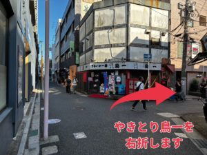 2.焼き鳥屋さん「鳥一」のあるT字路を右折してください