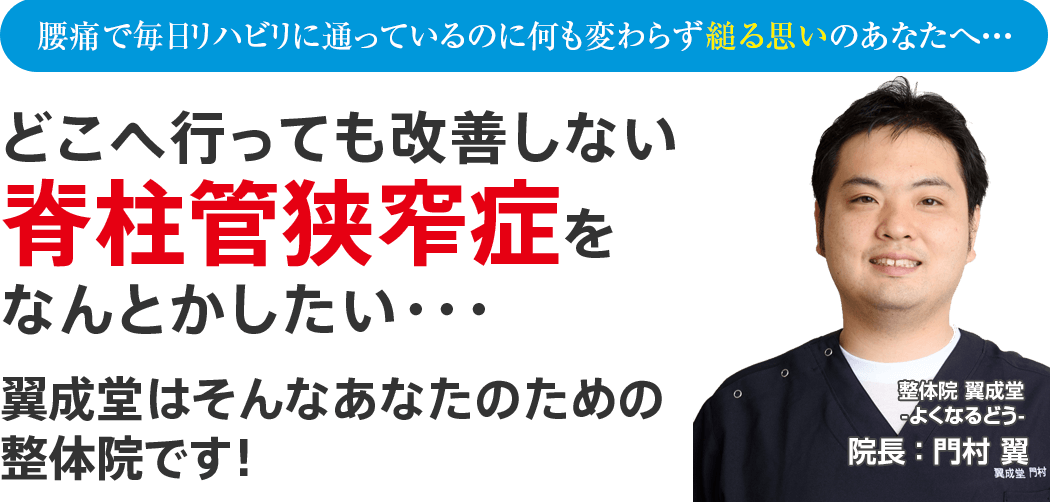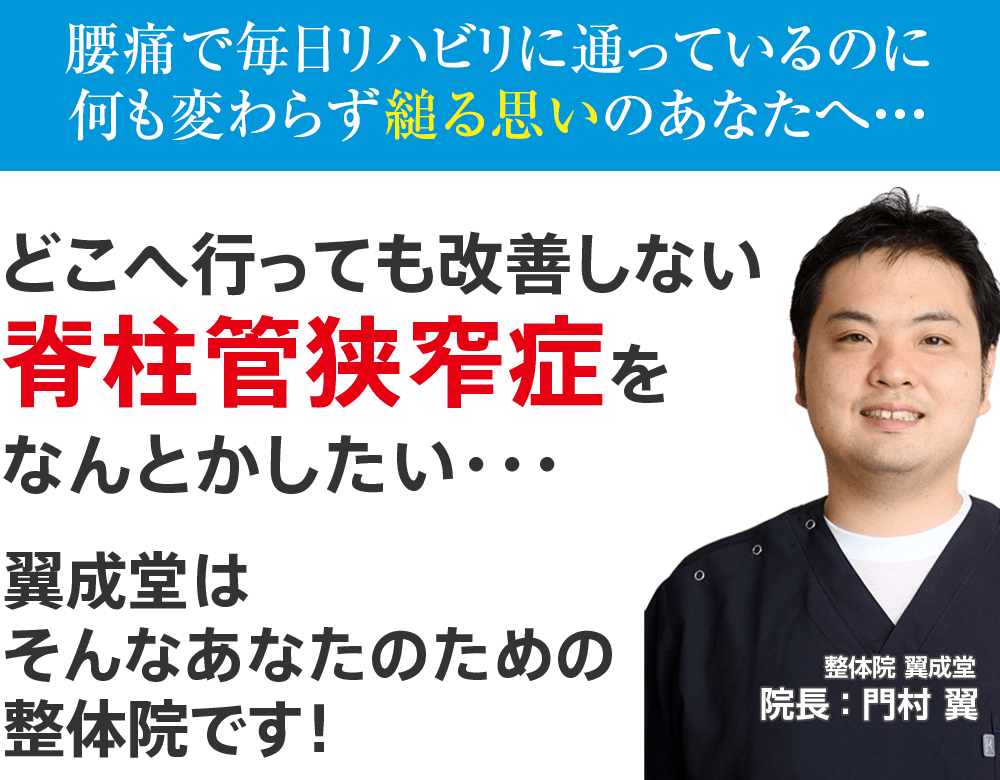 もしあなたが上記のようにお悩みなら、心の奥底でほんの少しでも良くなりたいとお思いなら整体院 翼成堂~よくなるどう~に来院し、整体でその辛い脊柱管狭窄症を根本から改善させてみませんか、ということです。